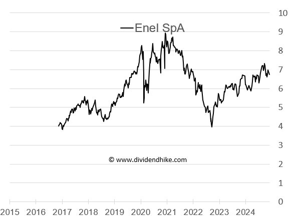 Another company from Europe known for its high yield and annual dividend increases is utility Enel from Italy. Enel has a dividend yield of 6.2% with now 10 consecutive years of increases.