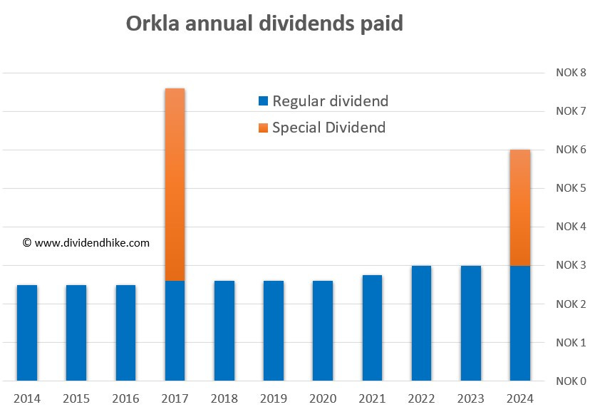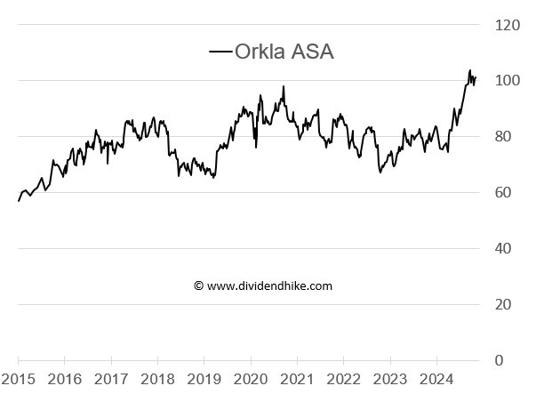 Orkla is known for its super strong dividend history with decades of steady and increasing payments with as a big bonus special dividend payments once every couple of years. There are not many companies in Europe with a dividend track records like Orkla. Think about decades without a dividend cut, a 3% regular dividend yield and a total dividend yield of almost 6% if we include special dividends. In 2024 Orkla paid a record high regular dividend of 3 Norwegian Kroner (NOK) per share together with a special dividend of also 3 Norwegian Kroner. The total dividend of 6 Norwegian Kroner results in a 6% dividend yield at a stock price of 101 Norwegian Kroner. We expect Orkla to increase its regular dividend in 2025. Also we expect Orkla to announce more special dividends down the road. The stock has gained 29% in 2024 so far which is no surprise to us because of the amazing dividend history and prospects.