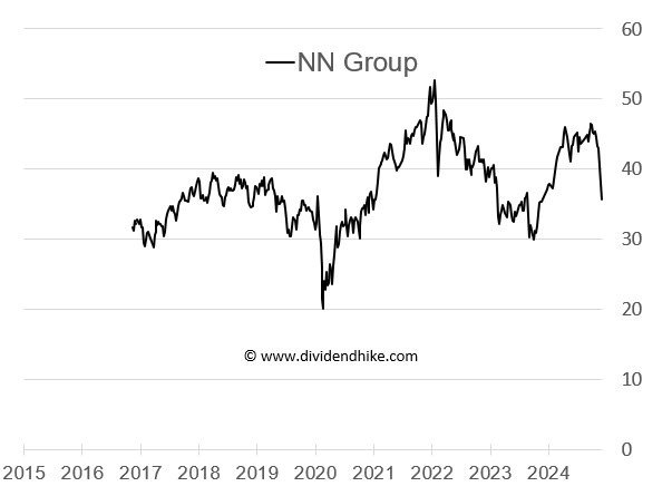 NN Group initiated a dividend in 2015 and has since hiked its dividend by double digits on average every single year with the five year CAGR standing at a whopping 11%, which is not bad for a company with a dividend yield of 7.8%. So imagine this: A super high dividend yield with double digit annual increases. You will not find a company with these statistics in the United States. NN Group hiked its dividend by 14.7% to a record high of €3.20 for 2023 and already announced a 14.2% increase for the interim dividend for 2024. It is expected that NN group will also announce a higher final dividend early 2025. This would mark the 10th consecutive year of dividend increases, with double digit hikes in the last couple of years and a current yield of almost 8%. That is unbelievable!