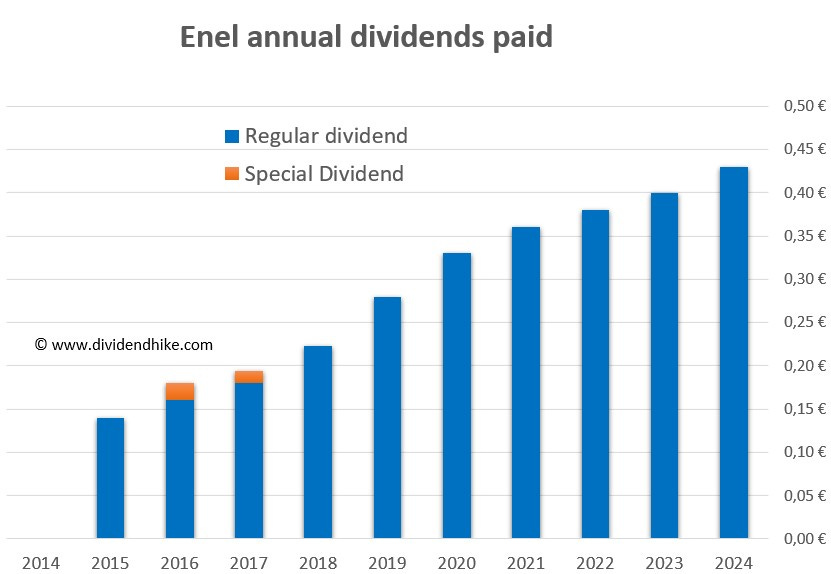 Enel paid a record high dividend of €0.43 per share for 2023, up 7.5% from the 2022 year. This November Enel also declared a new unchanged interim dividend of €0.215 per share for 2024. Enel's dividend policy focuses on providing stable and sustainable dividend growth. The company aims for a payout ratio of around 70% of net income, depending on its financial performance. Enel has consistently increased dividends in recent years, balancing shareholder rewards with reinvestment for growth and sustainability. Dividends are typically paid annually and may include both regular and special dividends.