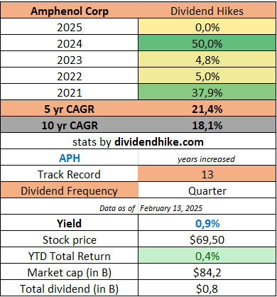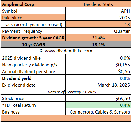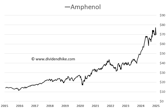 The stock is Amphenol Corporation (ticker APH), one of the Dividend Heroes in 2025 because of its massive 50% dividend hike in 2024.
