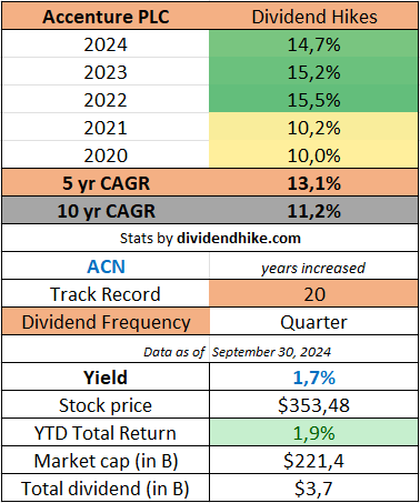 On September 26, 2024 Accenture plc (ACN) announced a new quarterly dividend of $1.48 per share, up 14.7% from the previous quarterly dividend. With this ACN continues its impressive streak of double digit dividend hikes. In the last decade the total dividend was raised by 190% with double digit increases in each of the last five years.