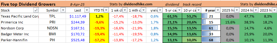 Please note that Texas Pacific Land, Primerica, and Parker Hannifin are also part of the Dividend Hike Portfolio. All of the stocks listed above have experienced a decline of double digits, with Primerica already announcing a 15.6% dividend increase this year.