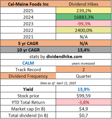 Cal-Maine Foods CALM 0.00%↑ has announced a new quarterly dividend of $3.456 per share, marking its second dividend increase of the year. Following a 46.2% increase in Q1, the company is now raising the dividend by an additional 132%, resulting in a year-to-date increase of 239.2%.