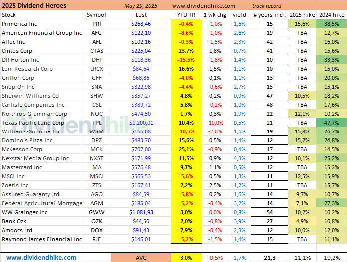 In our next update, we’ll share more detailed dividend stats on the Heroes—including which companies have already announced dividend hikes. The plan is to alternate monthly between the Dividend Hike Portfolio and the Dividend Heroes!