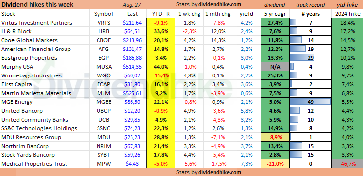 Week 35: Big dividend hikes by AFG, CBOE, EGP and HRB in 2024