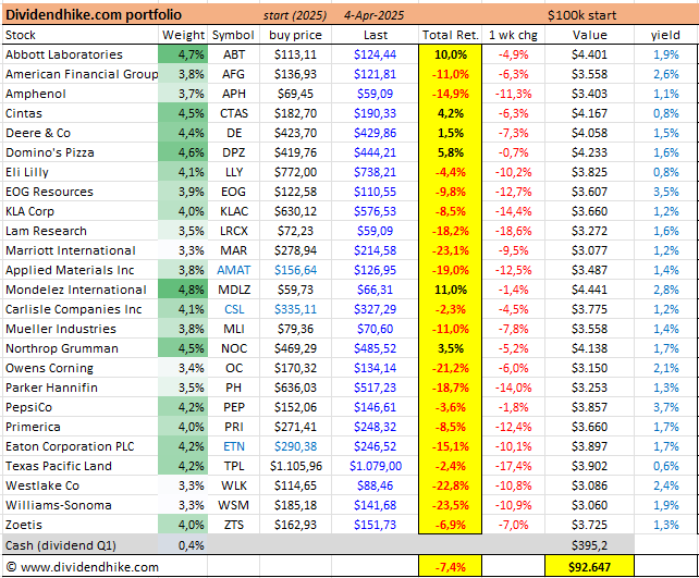 As of April 4, 2025, our Dividendhike Portfolio is showing a -7.4% total return. Not a great feeling, we know. Losses hurt—no way around it. But context matters: the Dividendhike Portfolio is actually holding up better than the broader market.