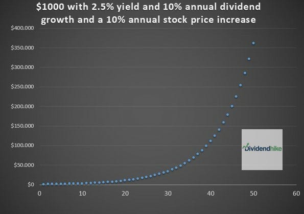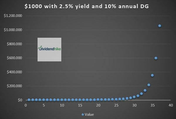 It is therefore bizarre that an investment of $1000 with a 2.5% dividend yield, 10% dividend growth and no capital gain has already grown to $1 million after 37 years, while with a 10% capital gain per year it takes 59 years.