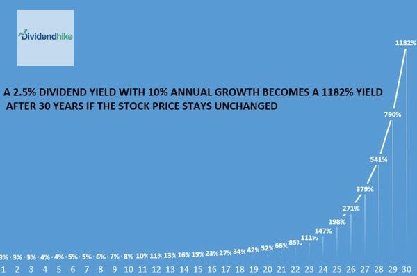 The calculation example does show how extreme the dividend yield can increase if the stock market price of a dividend growth stock remains the same. No investor will ignore a stock with a 10% dividend yield, let alone a 1100% dividend yield;