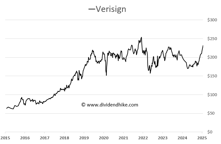 ✅ Verisign (VRSN) – The company behind .com and .net domain registrations, Verisign enjoys a monopoly-like status, generating steady and highly profitable recurring revenue. Warren Buffett is one of the biggest shareholders in Verisign. Verisign has yet to initiate a dividend, but it has aggressively repurchased its own shares, buying back nearly 30% of its outstanding stock over the past decade.