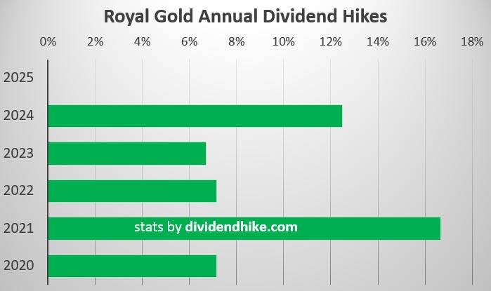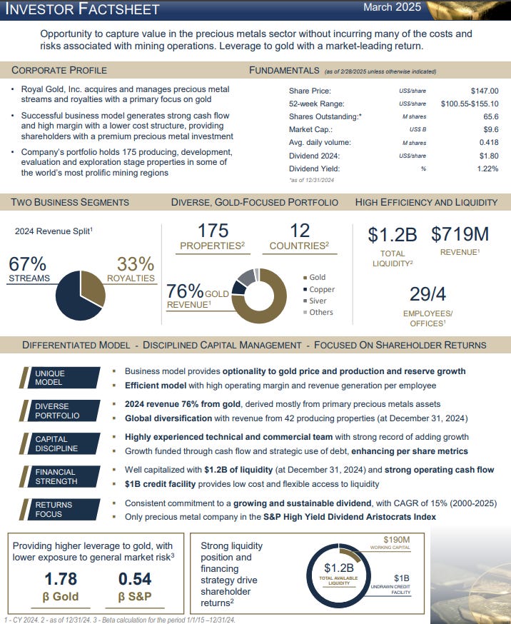 What makes this dividend growth possible? Royal Gold’s efficient streaming and royalty model generates high operating margins and substantial revenue per employee, providing resilience in various market conditions. The company's 2024 revenue came 76% from gold, primarily from high-quality, precious-metal-focused assets across 42 producing properties worldwide. With $1.2 billion in liquidity as of December 2024 and a $1 billion credit facility, Royal Gold is well-capitalized, funding growth through operational cash flow and strategic debt use while enhancing per-share performance.