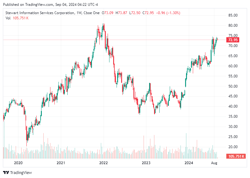 Stewart Information Services (STC) just announced a 5.3% dividend hike to $0.50 quarterly per share. The Stewart Board of Directors has approved an increase in the Company's annual cash dividend from $1.90 to $2.00 per share, beginning with the third quarterly payment of 2024 of $0.50 per share, payable September 30, 2024, to common stockholders of record on September 16, 2024.
