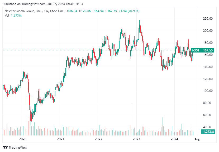 With 11 consecutive years of increasing dividends, Nexstar's smallest hike in this period was 20%. The company's 10-year compound annual growth rate (CAGR) for dividends is an impressive 27.4%, underscoring its consistent and robust dividend growth strategy.