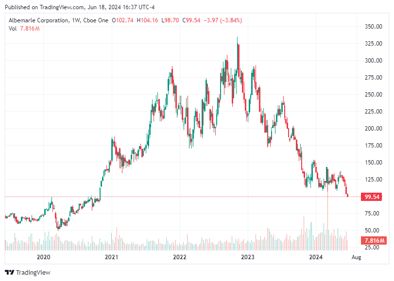 Description: Albemarle, a global specialty chemicals company, has experienced a significant decline of 29.8%. The company's performance has been impacted by challenges in the lithium market.