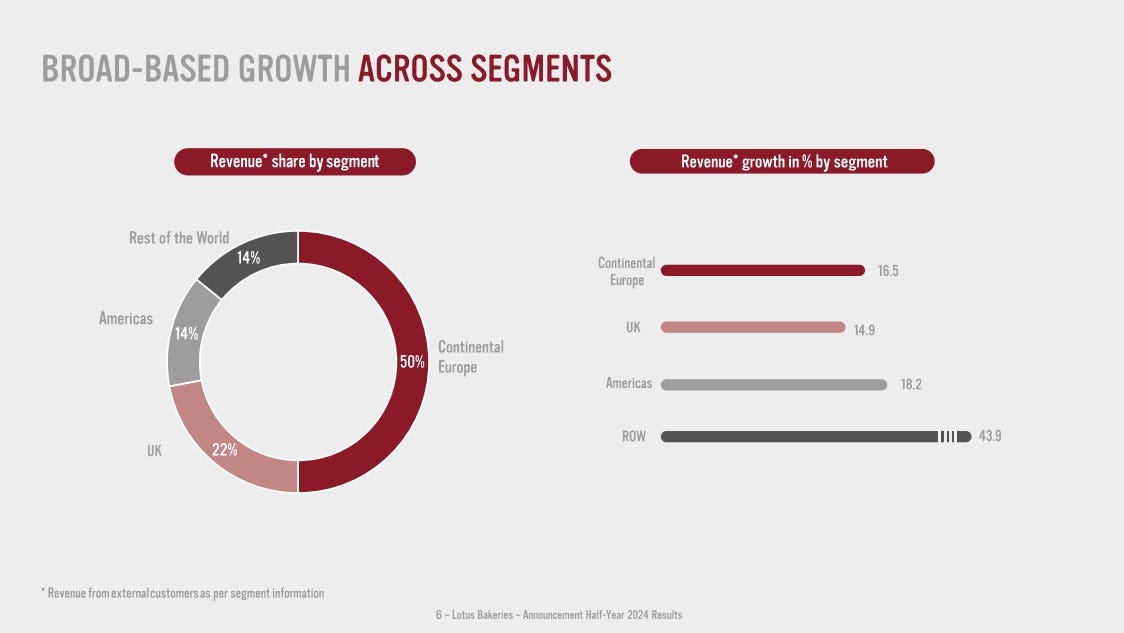 The sales increase has been driven by a robust and broad-based volume growth of over 16% across geographical segments and the three main product divisions. The largest division, Lotus Biscoff, saw volume growth exceeding 20% in the first half of the year, with this growth being geographically widespread.
