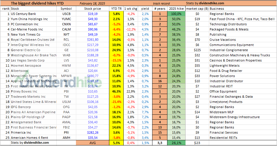 Check out the top-25 biggest dividend hikes in the USA in 2025 with detailed stats below! (paying subscribers only).