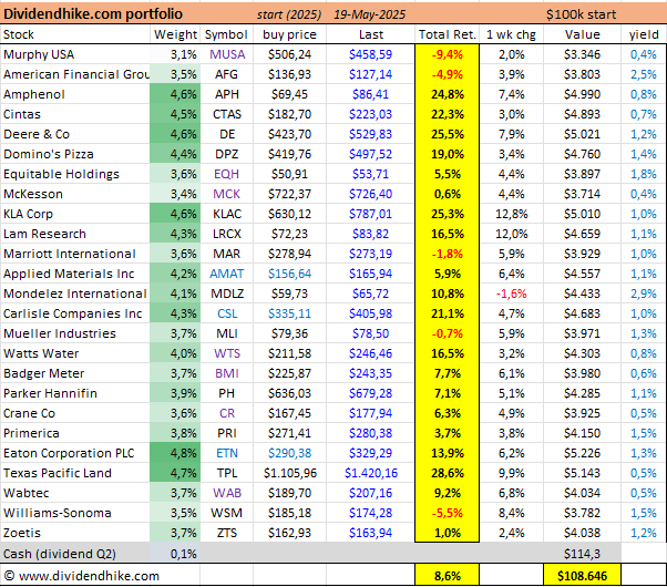 As of May 19, the Dividend Hike Portfolio—now consisting of 25 stocks—is up 8.6% for 2025. That’s a solid result, especially when compared to the major U.S. indices and the Dividend Aristocrats, both of which are underperforming significantly this year.