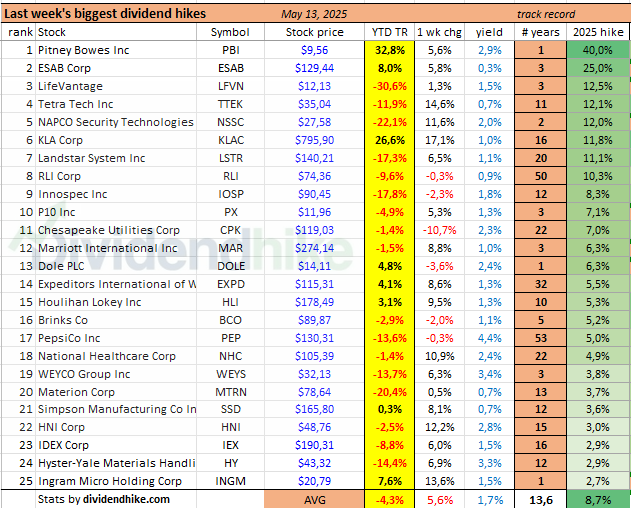 Below, we present the top 25 dividend hikes of the week, including year-to-date returns, one-week performance, current yield, and dividend growth track record (years of consecutive increases).