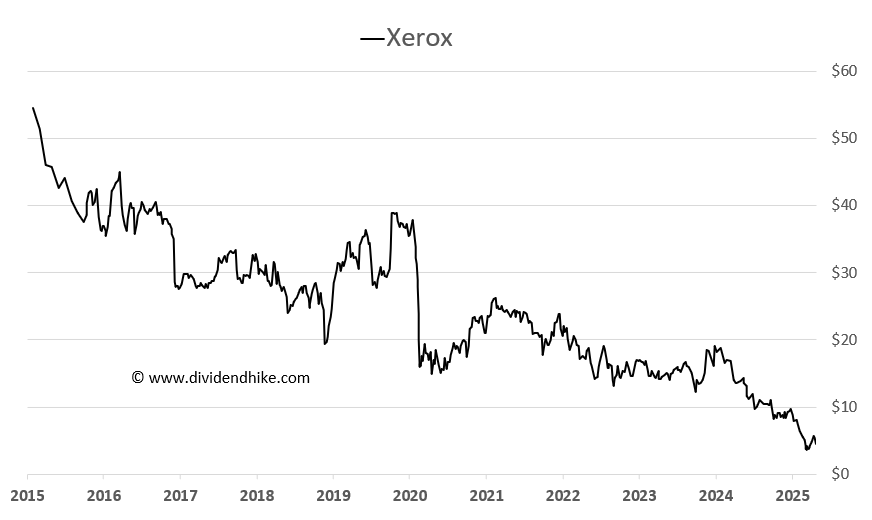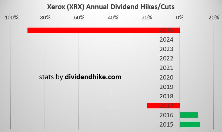 The stock has now lost over 90% of its value in the past 10 years, including a 47% drop in 2025 alone. Xerox had already cut its dividend once in 2017 (–19.4%), then held it flat at $0.25 per share—an ominous plateau.