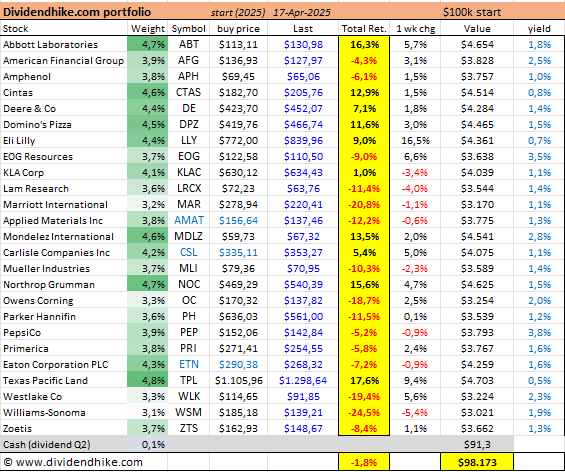 Below is the full Dividend Portfolio as of April 17, 2025.